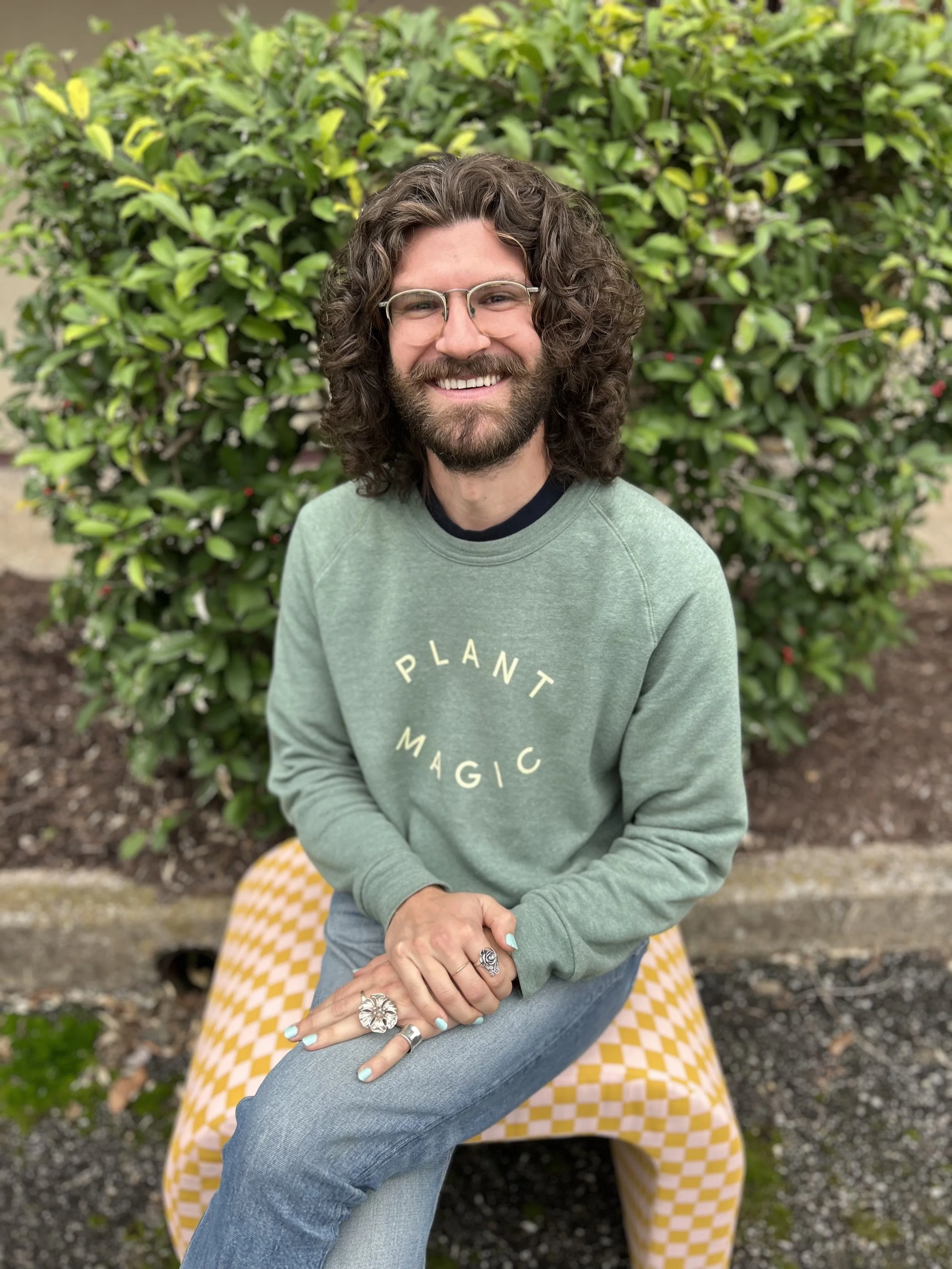 Image: A person (me!) in a sage sweater sits in front of a green bush. They have long curly hair, glasses, a beard, silver rings, and mint nail polish.