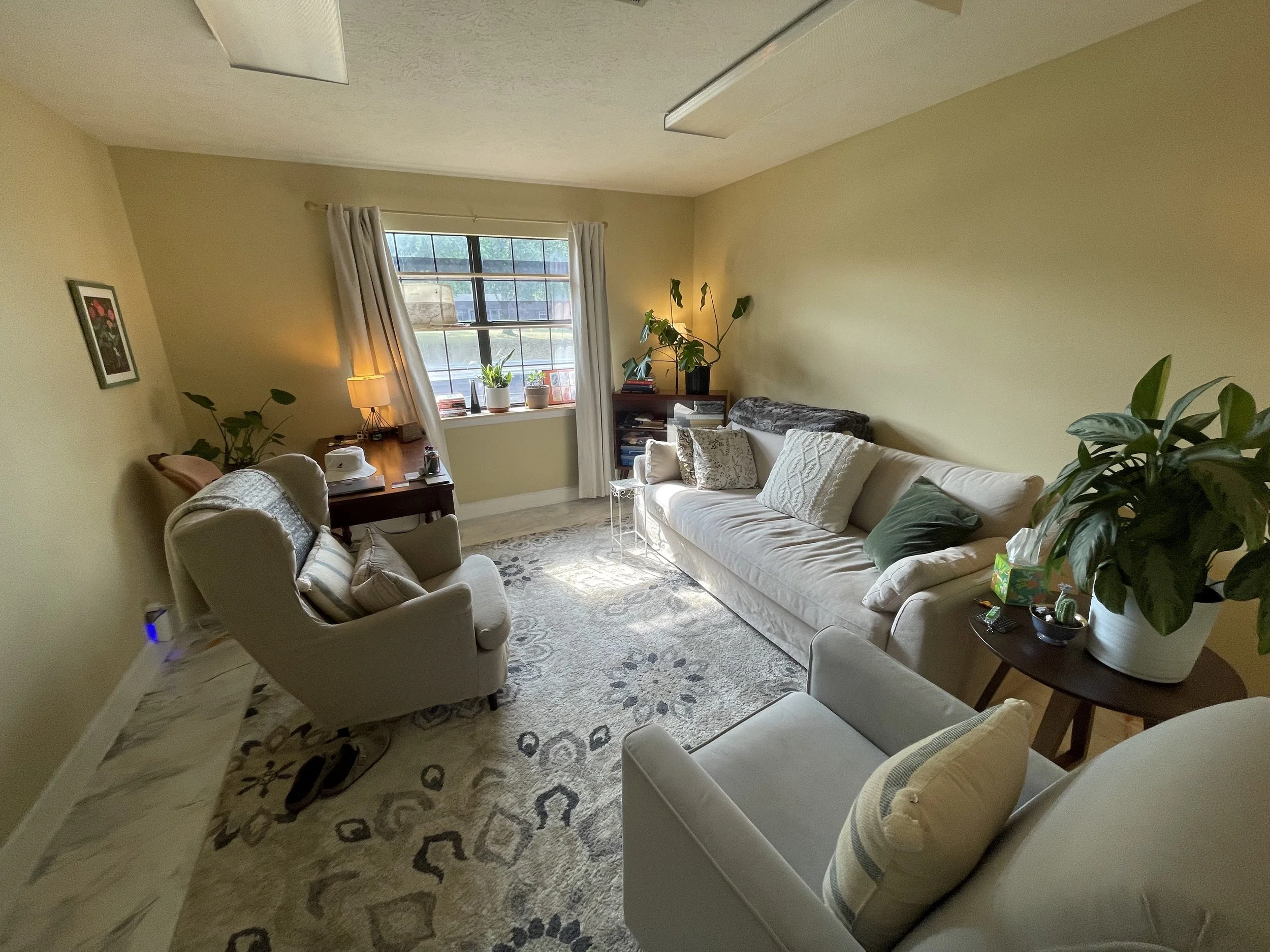 The office has a big, comfy couch and a rocking chair that can recline, many plants and art supplies, and has an east-facing window.